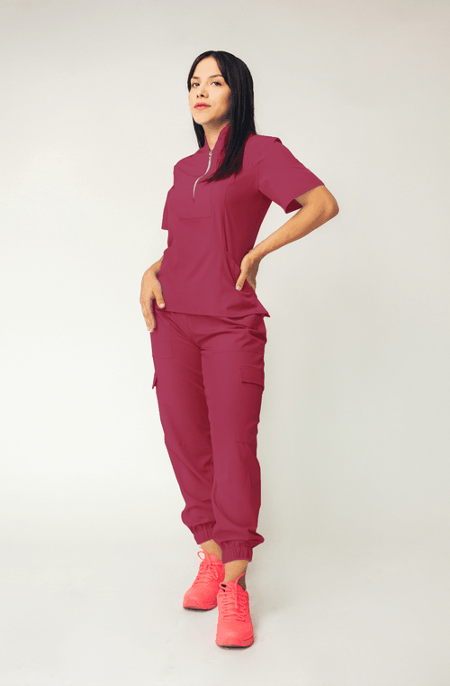 Bertha moderniza el clásico quirúrgico con una filipina de cuello mao y cierre en escote. El pantalón con corte tipo jogger con bolsas cargo con cartera equilibra movilidad y funcionalidad para turnos largos.