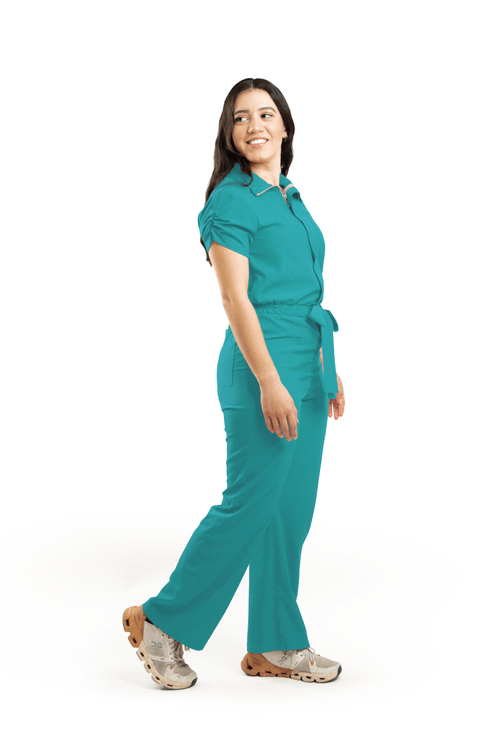 Maria es un jumpsuit que simplifica tu rutina sin ceder elegancia. Estructura limpia y detalles funcionales para una silueta pulida en clínica u hospital.