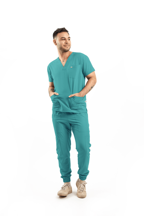 Ricardo prioriza un look limpio con desempeño profesional. Pantalón con corte tipo jogger, bolsas delanteras y traseras, bolsas tipo cargo en los costados y bolsa para celular; pretina con elástico para confort durante la jornada. Cuello V, estética más sport.