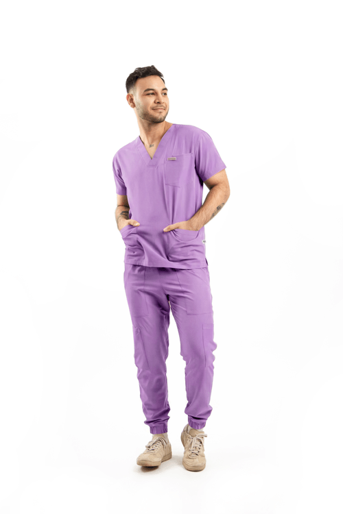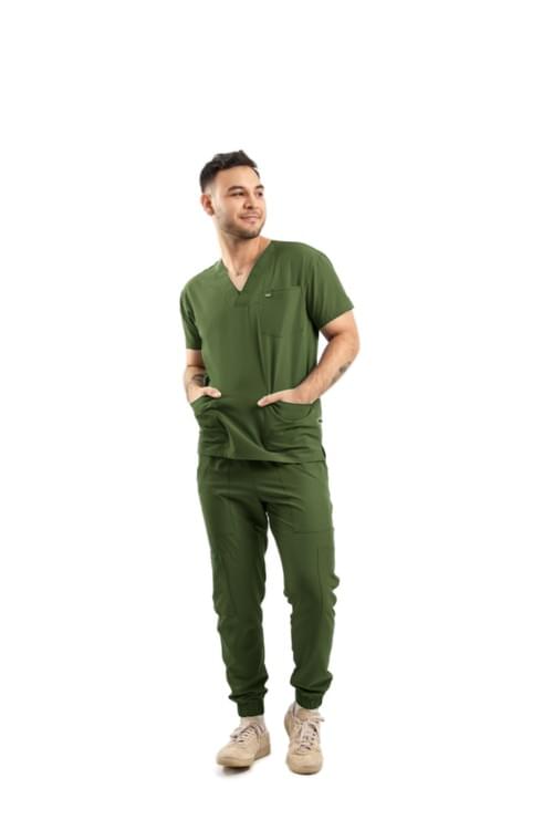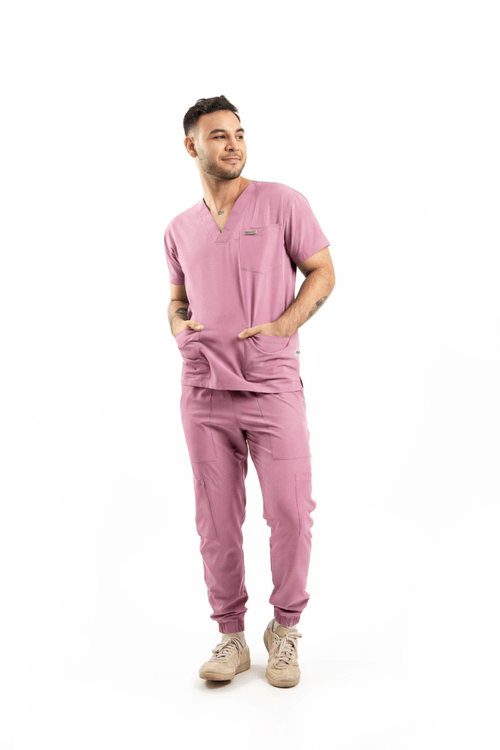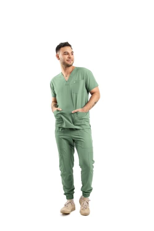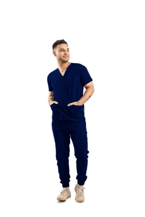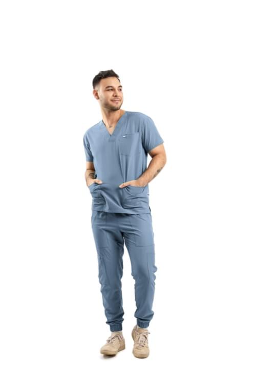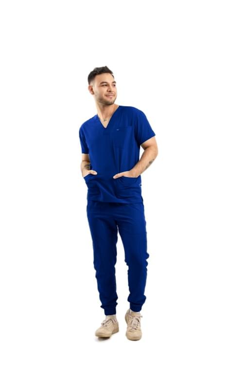 Ricardo prioriza un look limpio con desempeño profesional. Pantalón con corte tipo jogger, bolsas delanteras y traseras, bolsas tipo cargo en los costados y bolsa para celular; pretina con elástico para confort durante la jornada. Cuello V, estética más sport.