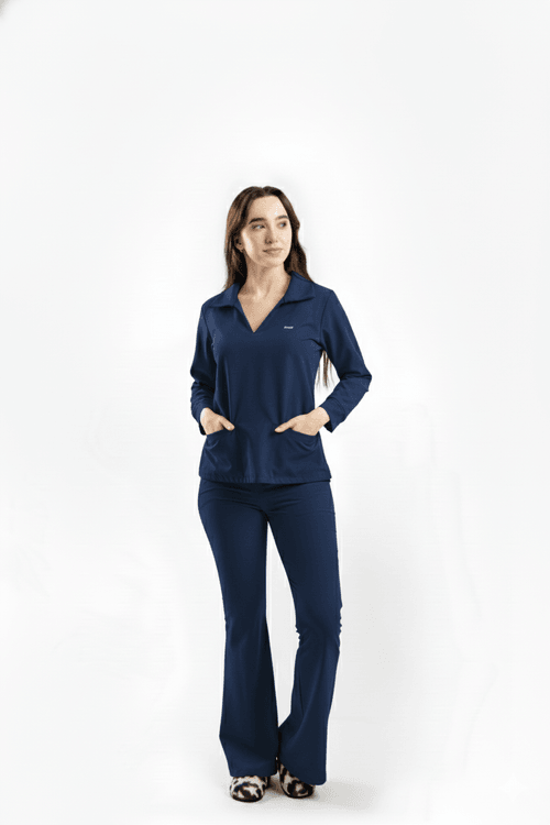 Siria combina silueta femenina y soporte práctico. Pantalón campana y filipina de manga larga con detalles de bolsillería vivo para operación y estilo.